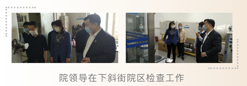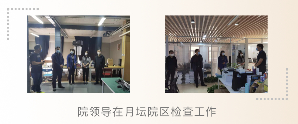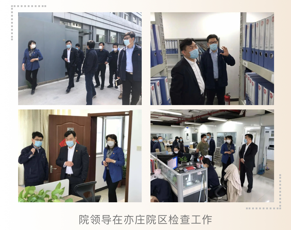 为更好的推进复工复产和疫情防控工作,保障安全生产、杜绝隐患 ,4月29日和4月30日,刘挺院长、宫滨书记、陈秀竹书记和后勤保障部季钧部长在各部门负责人的陪同下分别对亦庄院区、下斜街院区和月坛院区的疫情防控和安全生产保障情况进行了为期两天的工作检查。