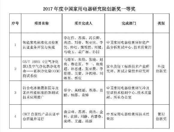 颁发2017年度中国家用电器研究院创新奖一等奖