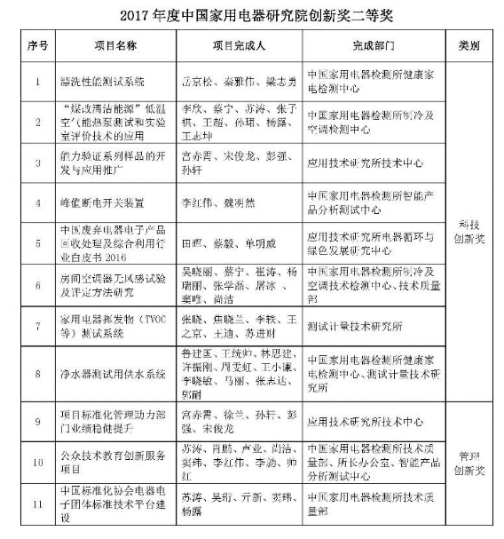 颁发2017年度中国家用电器研究院创新奖二等奖