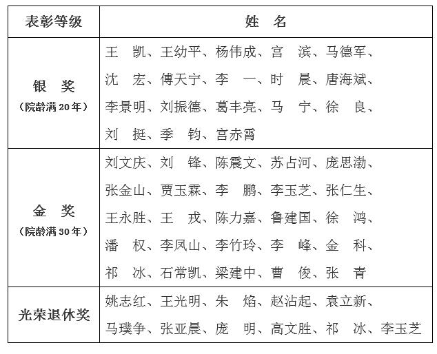 最后,为表彰先进,增强团队凝聚力和集体荣誉感,本次大会还向院龄满20年、院龄满30年和退休员工进行了表彰,并分别授予银奖、金奖和光荣退休奖。