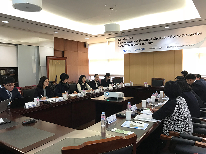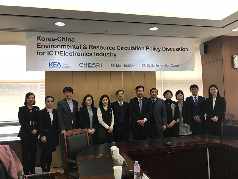 2018年3月8日,中国代表团与韩国电子信息通信产业振兴会(KEA)在韩国首尔,针对电器电子产品绿色供应链政策及绿色认证开展座谈。KEA副会长、环境部门负责人、以及韩国环境产业技术院的专家、企业代表参加了座谈。