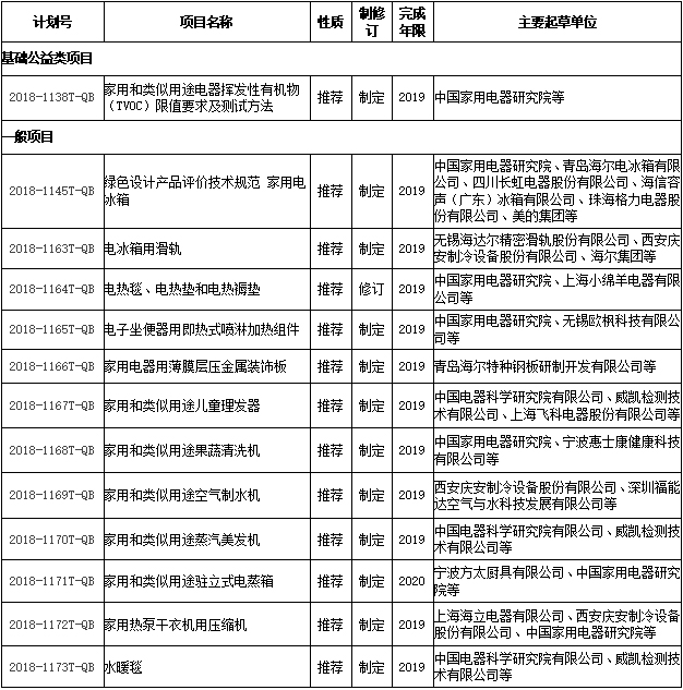 2018年5月11日,工业和信息化部办公厅发布“关于印发2018年第二批行业标准制修订和外文版项目计划的通知”【工信厅科〔2018〕31号】。其中,全国家用电器标准化技术委员会归口的标准计划共计13项,具体项目如下: