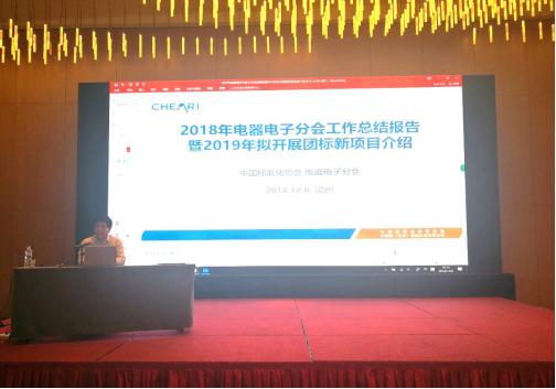 最后,中国标准化协会电器电子分会祁冰秘书长对2018年电器电子分会的工作进行总结汇报,并针对2019年拟开展团标新项目进行重点介绍。