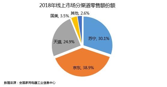 年度报告数据显示,2018年,彩电产品线上市场零售额占比36.3%,空调产品线上市场零售额占比30.7%,冰箱产品线上市场零售额占比35.2%,洗衣机产品线上市场零售额占比40.4%,厨卫产品线上市场零售额占比25.6%,生活电器由于自身的产品特性,线上市场零售额占比高达59.1%。