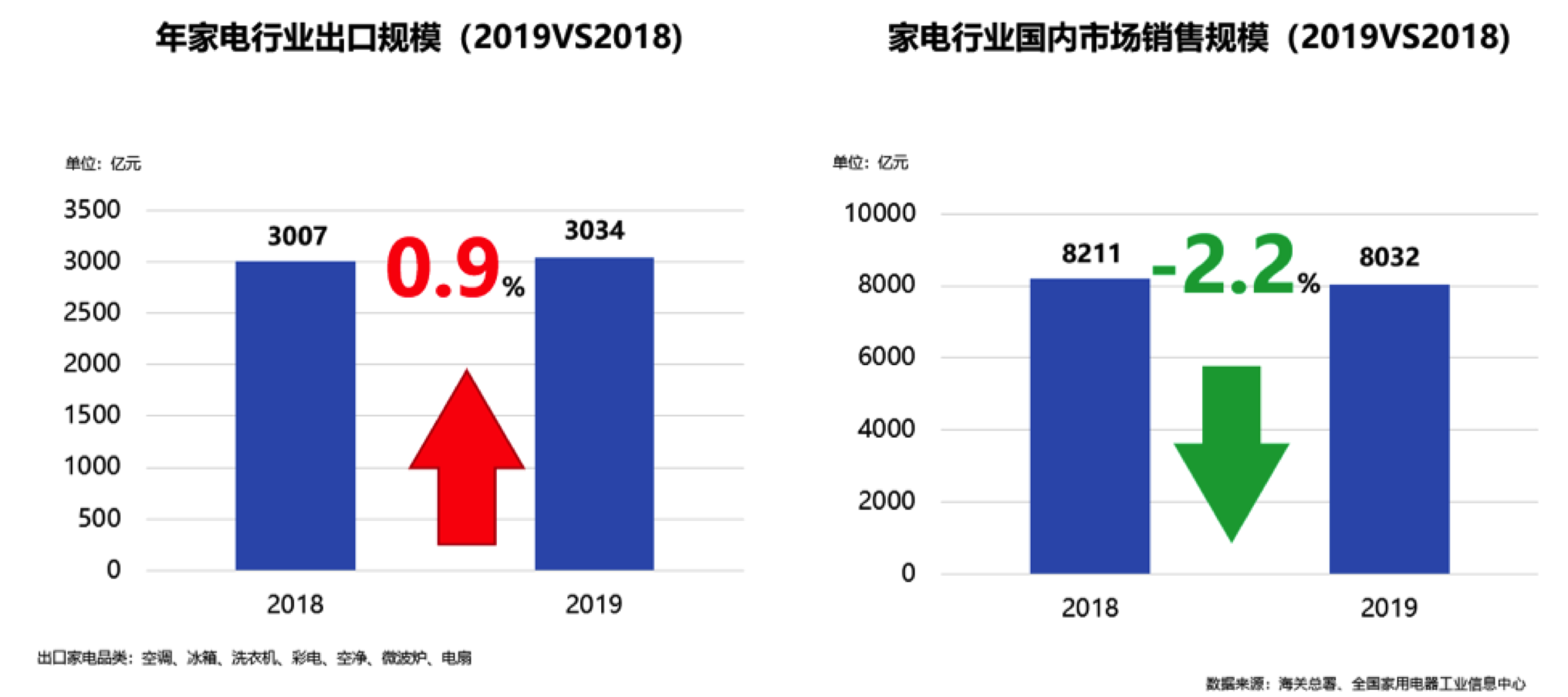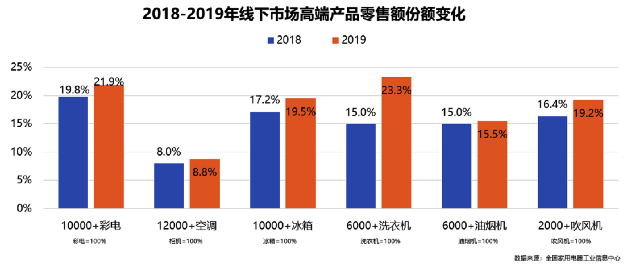2019年的中国家电行业,正是处在这样一个阵痛与希望并存的大环境中。居民部门杠杆率的上升、食品价格上涨的压力、持续走低的结婚率与出生率、民营和中小企业的融资困难等问题,拖累了家电市场规模的进一步壮大。全国家用电器工业信息中心数据显示,2019年国内市场家电零售额规模8032亿元,同比增长率为-2.2%(由于增加家电品类,全国家用电器工业信息中心将2018年家电规模从8104亿修正为8211亿元)。