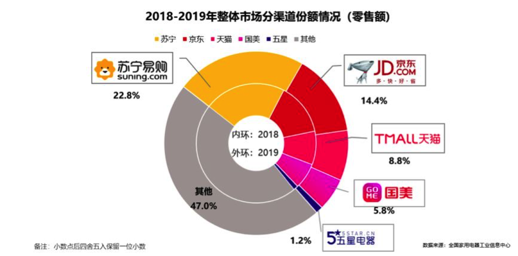 线上市场在中国消费市场中的重要性已经不言而喻,但线下市场在某些方面依然具有优势,比如在高端产品上,在“以旧换新”实施过程中,线下卖场都具备线上市场所不具备的优势,因此,线上和线下全渠道推进一直是家电企业和流通渠道推进的方向。线上平台不断向线下延伸自己的触角,比如苏宁易购依据线上线下全场景的运营,开展针对性强的销售活动;京东与五星合作,开拓自己的旗舰店。从全渠道的销售数据来看,正是得益于线上线下的协同发展,苏宁易购在整个家电市场的份额达到了22.8%,京东由于线下实体店的规模要小很多,市场份额为14.4%(包含五星电器,合计规模为15.6%)。