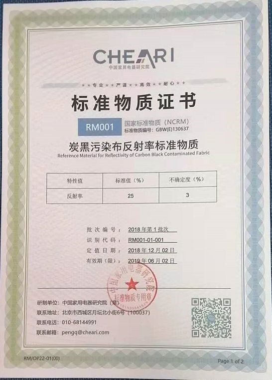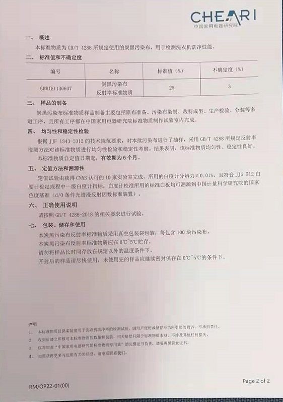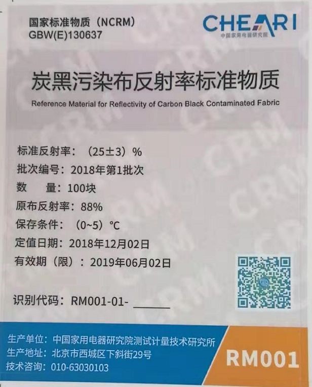 2019年3月1日起,中国家用电器研究院测试计量技术研究所将提供全新升级的炭黑污染布反射率标准物质,为洗衣机行业检测和研发人员提供高质量的服务,对洗净性能精准测试提供更好的保障。